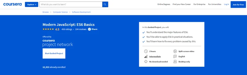 You may be aware that Coursera has released guided projects. In which you may learn new skills such as JavaScript in as little as 2 to 3 hours. While these guided projects aren’t as thorough as the courses on this list, they do serve as a decent starting point for newcomers. By following a guided project, you may rapidly master the fundamentals of JavaScript. For example, in this project, you’ll learn the most basic ES6 capabilities and put them into reality with real-world applications.