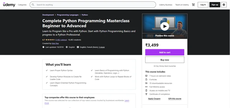 This is the most extensive, yet straightforward, Python programming language course available on Udemy! This course is for you whether you’ve never programmed before, know basic grammar, or want to learn about Python’s advanced capabilities. They will teach you Python 3 in this training.