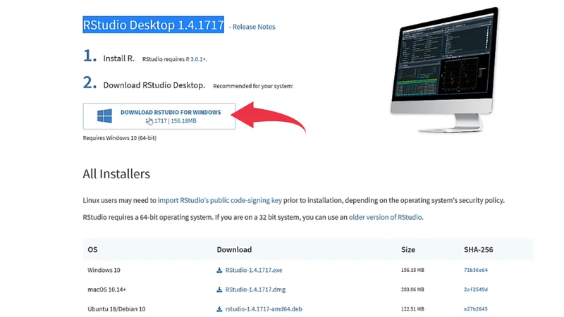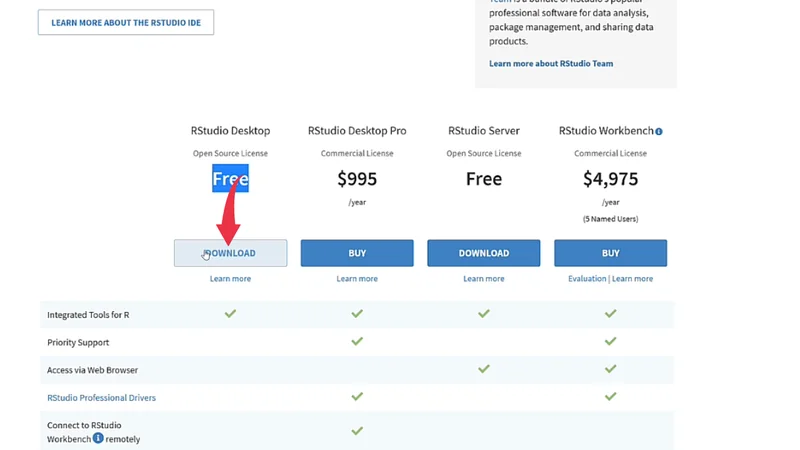 1) Now we’ll download and install RStudio, and to do so follow the below-provided download link and click on the RStudio Desktop and you’ll be redirected to the downloads page of RStudio.