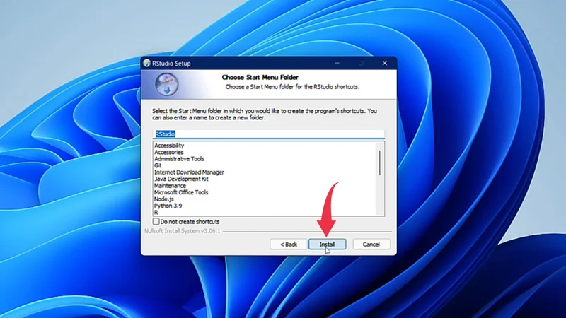 6) In the Choose Start Menu window simply click on the Install button and your RStudio installation will begin.