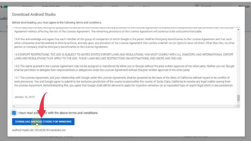 2) After that a licence agreement will show up. Simply tick the agreement checkbox and click on the Download Android Studio For Windows button. within few seconds Android studio will start getting downloaded.