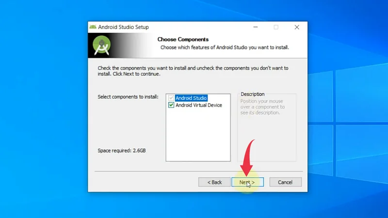 3) In the select components window tick the checkboxes of both Android Studio & Android Virtual Device and click on the Next button.