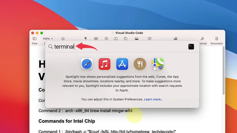 1) Firstly we will download the C++ compiler for our Mac machine and for that we’re going to download the MinGW compiler. So press Cmd+space,  type terminal in the search bar and press enter.