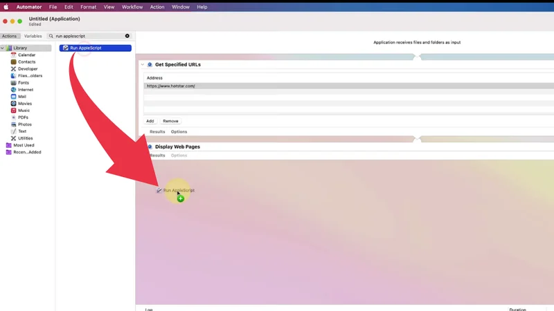 6) At last search for “Run Applescript” and drag this option to workspace too.
