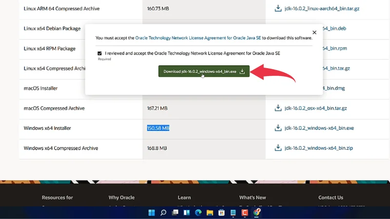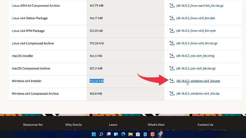 2) After that, you’ll be redirected to the “Java SE Development Kit Downloads” page. Now scroll down and there you’ll see a “windows X64 Installer” row and next to that a download link is given. Click on that link to download the installer for Windows 11.