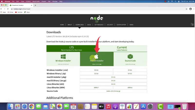 1) Firstly we’ll have to download the latest version of Nodejs available on the internet. Follow the below-provided download link and you’ll be redirected to the official Nodejs downloads page. Now simply click on the “Mac Installer” button and your download will start.
