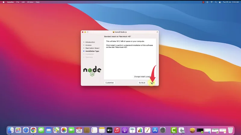 5) In this final step make sure you have 102Mb of free disk space available, click on the install button, if asked enter your Mac password and your installation of Nodejs will start.