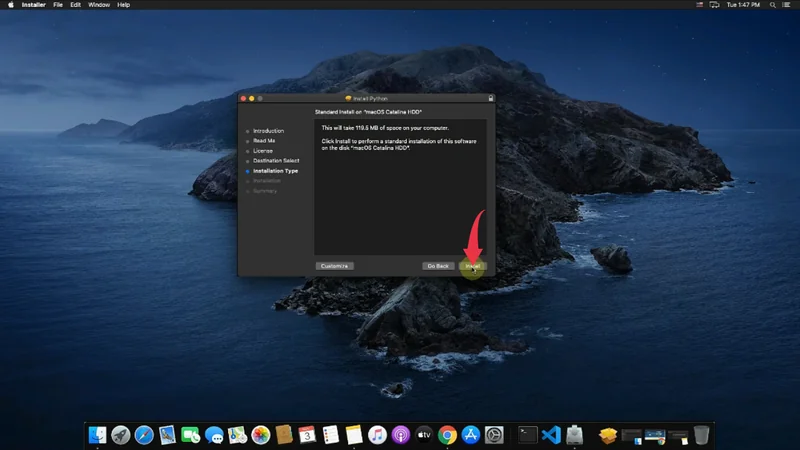 6) In the final installation window simply click on the install button and enter your password if asked, python will start getting installed in your Mac by now. Make sure you have at least 114Mb of free disk space available for python.