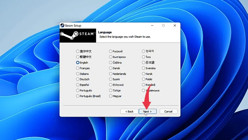 3) Now you’ll have to select the language of installation for the Steam engine. Select the English option and click on the Next button.