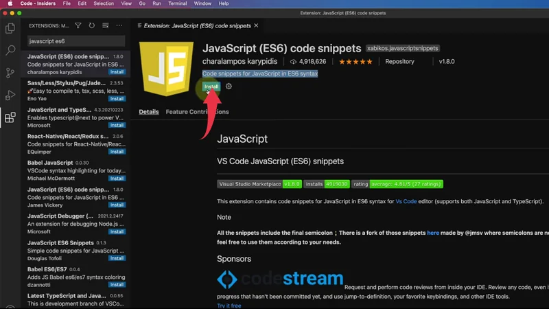 1) Open visual studio code and click on the extensions button. There in the search box type “JavaScript es6“, click on the first option provided by charalampos karypidis and install it by clicking on the install button.