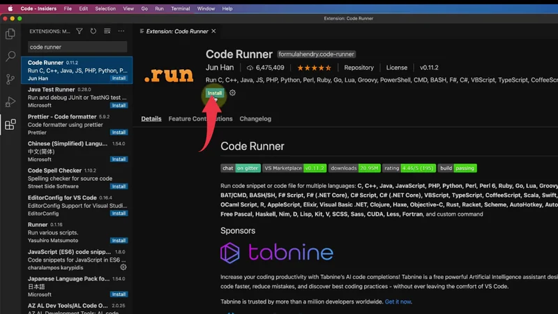 2) Now again search for “code runner” and select the first option provided by Jun Han and install it in the same way described above.