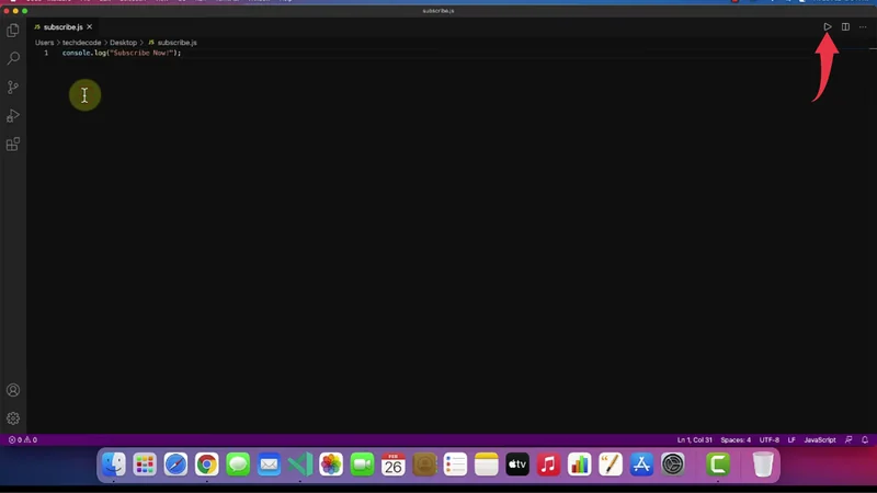 5) Paste the below-provided code snippet in the visual studio code and press “Cmd+S“. And click on the small play button to run your JavaScript program.