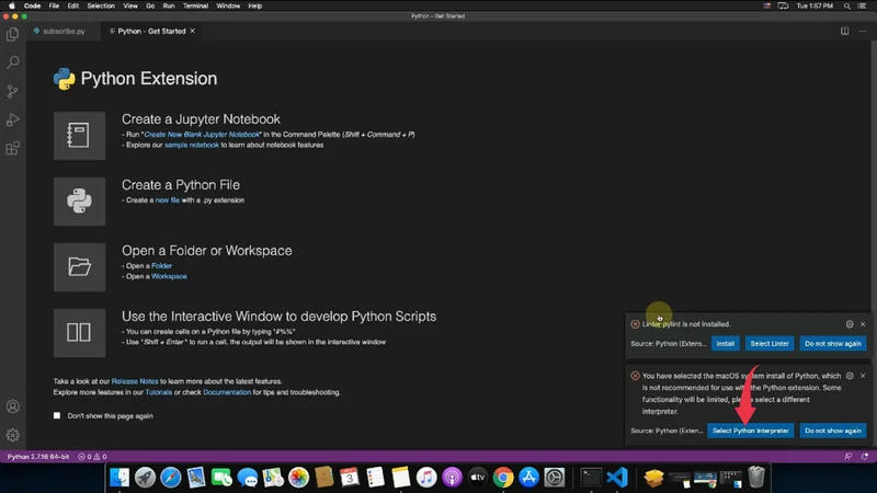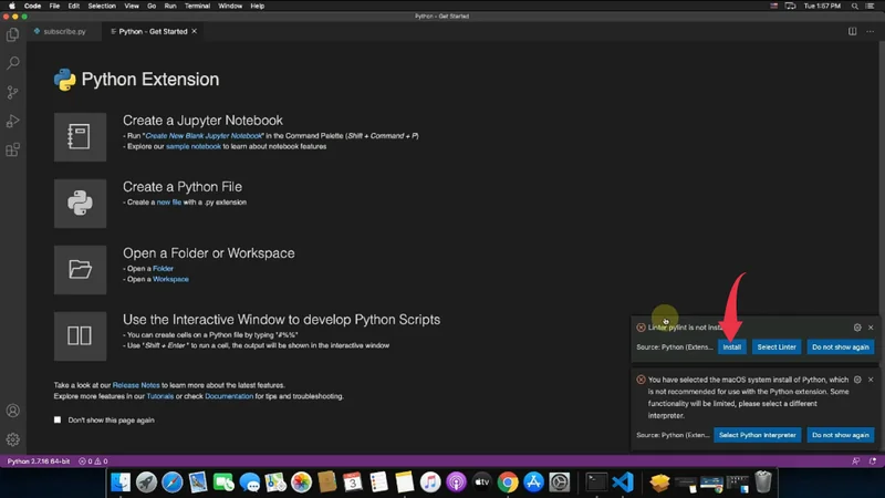 4) For the first time only you’ll be displayed a python get started guide. In this python guide, you’ll have to install the additional extensions required to run python programs on your Mac machine. Firstly you’ll have to install the “Linter pylint” extension by clicking on the install button in the bottom right alert box displaying “Linter pylint is not installed“.