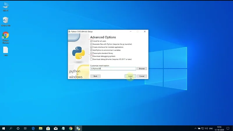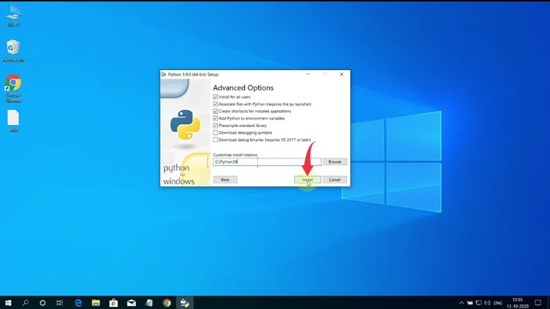 6) Next up, in the small text field type “C:\Python39” and then click on the install button.