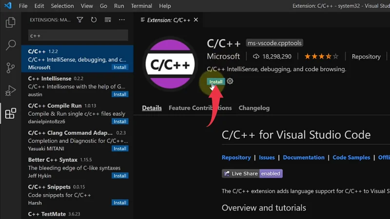 1) Open vs code, click on the extension button and in the search bar type C++, select the first option from Microsoft and click on the small blue install button.