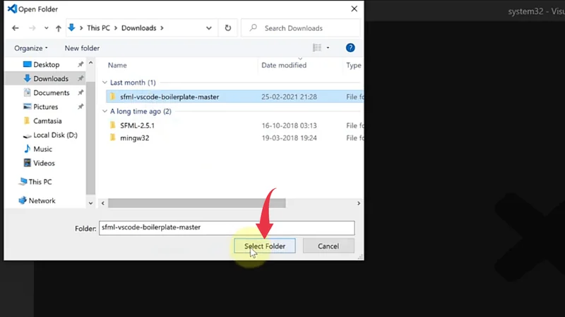 3) Here select the folder we have extracted from SFML vs code boilerplate zip file and click on the Select Folder button.