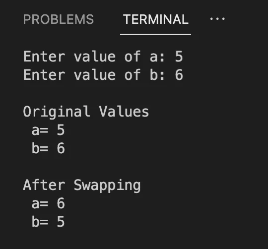 print('\nAfter Swapping\n a=',a,'\n b=',b)