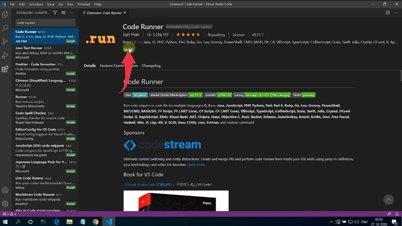2) Now again in the search bar type “Code Runner”. And install the first option provided by Jun Han by clicking on the small green install button.