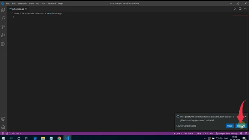 2) After saving the file, a small dialogue box will appear and in that, you’ll be asked to install the required assets for running GO programs. This is just one time process so simply click on the “Install All” button.