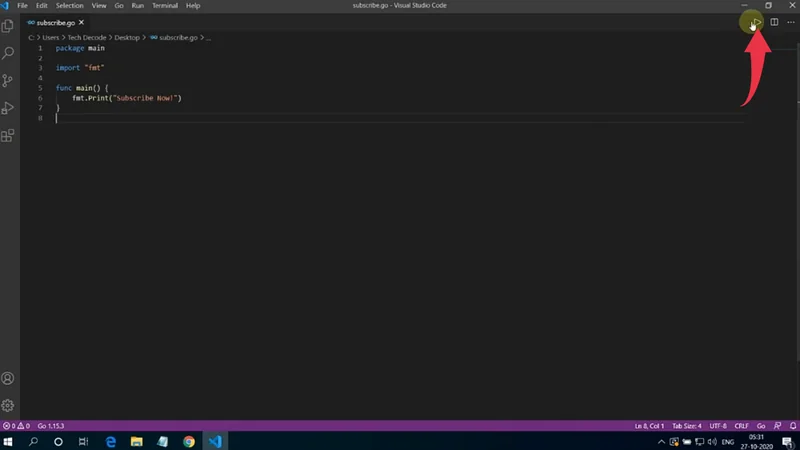 3) paste the below-provided GO code, save the file by pressing “Ctrl+S” and press the small play button to run the program.