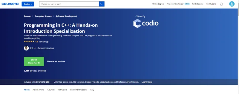 Another course for beginners to become professional C++ programmers is the specialization offered on the Coursera platform. Designed by Codio, this C++ specialization gives more exposure to fundamental concepts in a practical way. In this C++ specialization, you will complete four minor courses. Among these four minor courses, one is for projects.