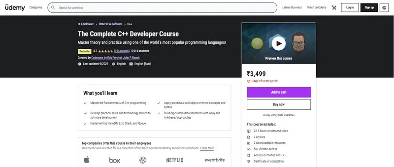 If the courses mentioned above seem very long, this course might become the best fit for you. The concise and easy-going curriculum of this makes It very interesting. After completing each section, you’ll get exciting exercises to test your knowledge about the topics taught. Also, at the end of this course, you’re going to be building an excellent C++ project for your collection.
